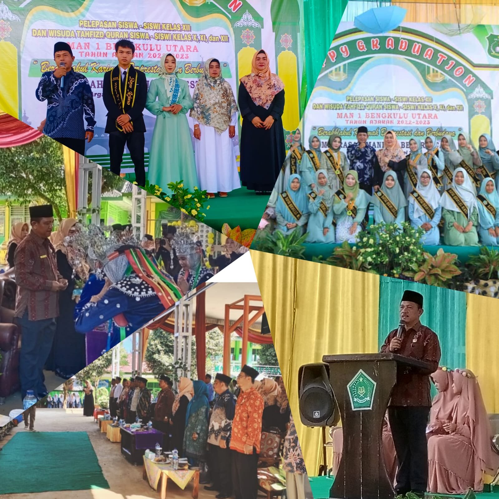 Acara pelepasan ini dihadiri oleh seluruh siswa MAN 1 Bengkulu Utara kelas X, XI, dewan guru dan staf tata usaha. Hadir dalam acara ini Kabag TU Kemenag Bengkulu Utara Samsir Alamsyah, S.Ag M.Hi, Kasi Penmad Kemenag Bengkulu Utara Choiril Anwar, S.Pd, pengawas madrasah Dedi Harlian, M.Pd, pengurus komite MAN 1 Bengkulu Utara dan tamu undangan lainnya. Untuk tahun pelajaran 2022/2023 ini MAN 1 Bengkulu Utara melepas 113 siswa kelas XII IPA dan IPS. Acara pelepasan juga dirangkai dengan Wisuda Tahfiz Qur’an untuk siswa kelas XII, XI dan X yang berjumlah 27 orang siswa.